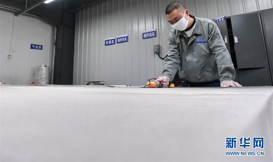在四川北川天讯新材料有限公司,工作人员对导电布测电阻(3月9日摄)。 新华社记者 薛玉斌 摄