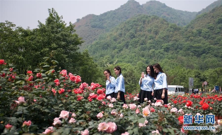 来自成都的老员工在位于四川绵竹市的“中国玫瑰谷”游览拍照(4月18日摄)。新华社记者 张帆 摄