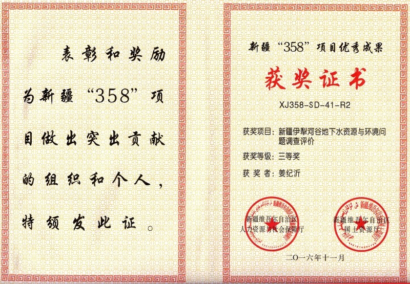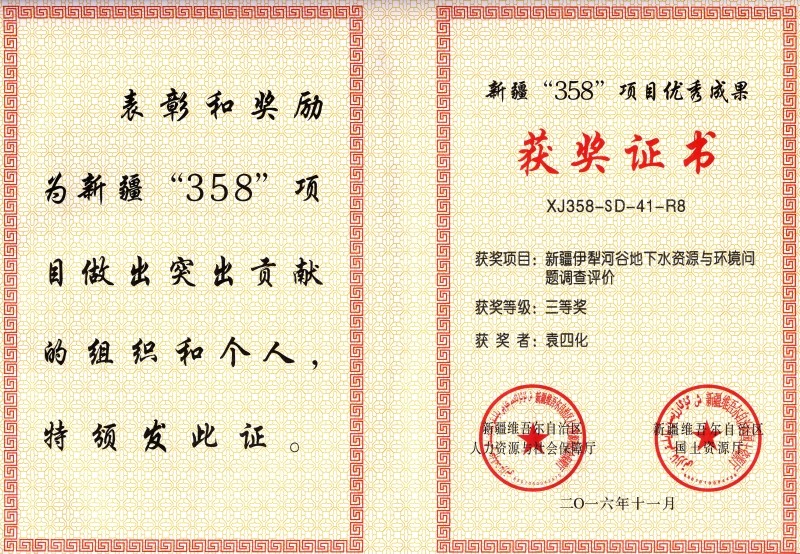 根据新疆维吾尔自治区国土资源厅《关于新疆“358”项目先进单位优秀成果和先进个人的表彰决定》(新人社发〔2016〕156号),15vip太阳成集团古天乐作为第二完成单位参与完成的《新疆伊犁河谷地下水资源与环境问题调查评价》项目获得“新疆‘358’项目优秀成果”三等奖。该项目隶属于中国地质调查局实施的“西北大型盆地水文地质调查计划”项目,由中国地质调查局西安地质调查中心于2012年至2015年组织实施。