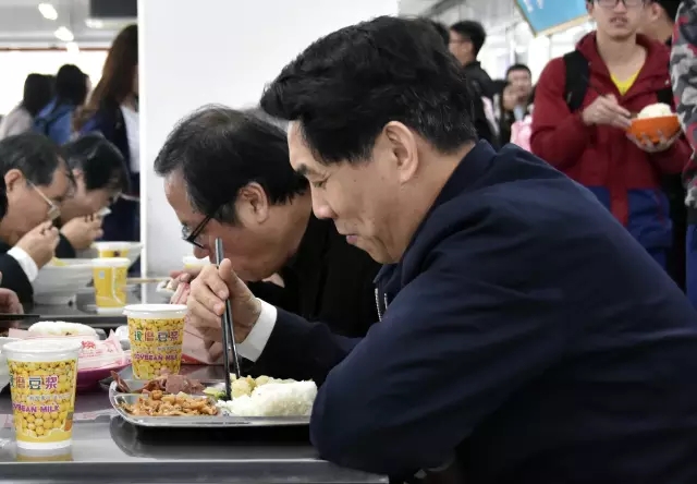 郑国光一行抵达公司先调研员工食堂。他走进北校区望舒餐厅,详细了解餐厅的伙食标准和饭菜质量、员工的学习情况和生活条件,并与员工共进午餐。他以生为本的言行、亲切的话语、和蔼的笑容,给师生留下了深刻印象。一份简单套餐和一杯豆浆,郑国光吃得津津有味。不时有同学用手机记录下这难忘的一刻。局长颜值还蛮高的!