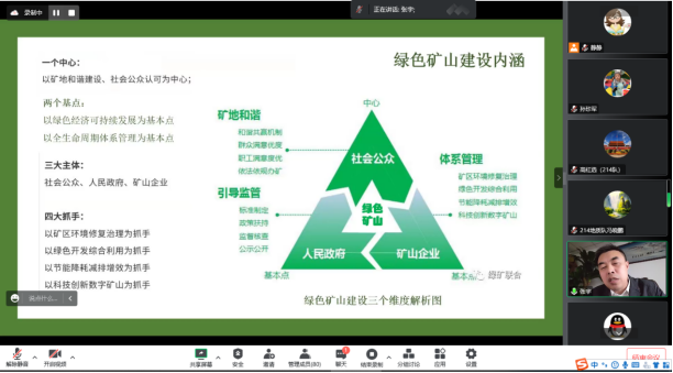 张宇高级工程师为大家详细介绍了绿色矿山建设的内涵、绿色矿山评价范围、评价方法及评价指标要点,并结合一系列具体案例深入解析了在实际工作中如何开展绿色矿山评价,最后张宇高级工程师还结合绿色矿山发展现状及发展趋势与参会师生就绿色矿山评价的相关问题进行了交流与探讨。