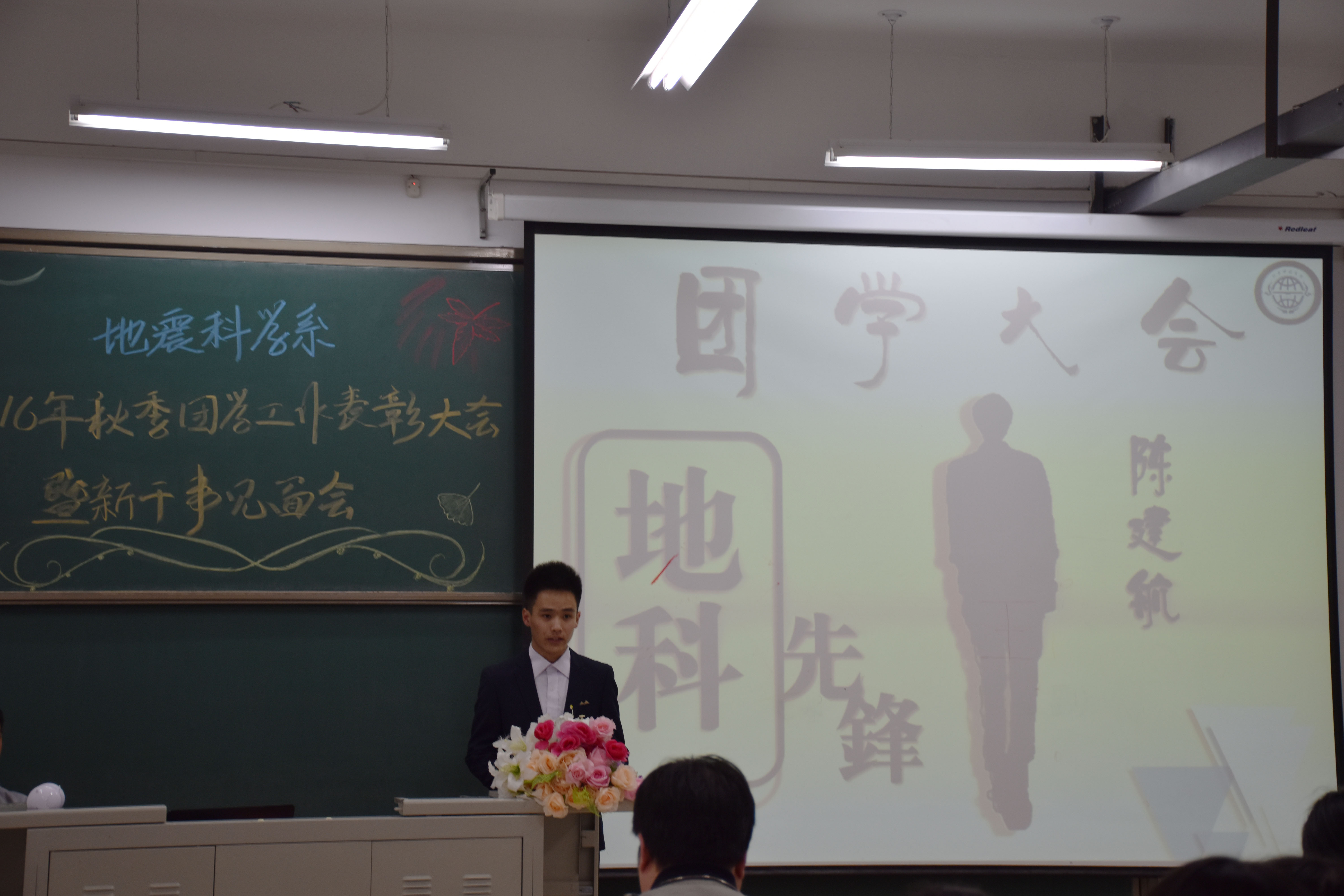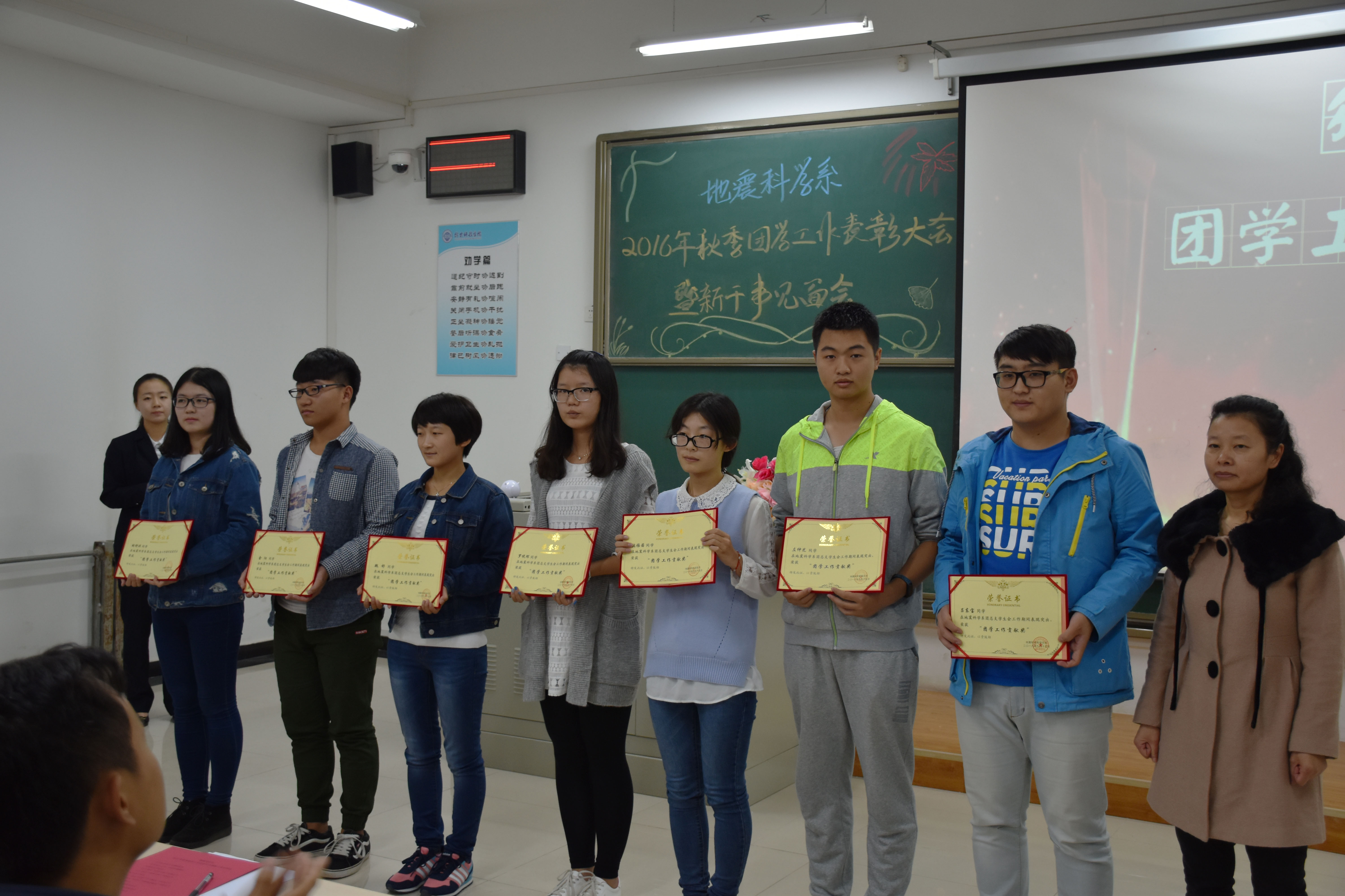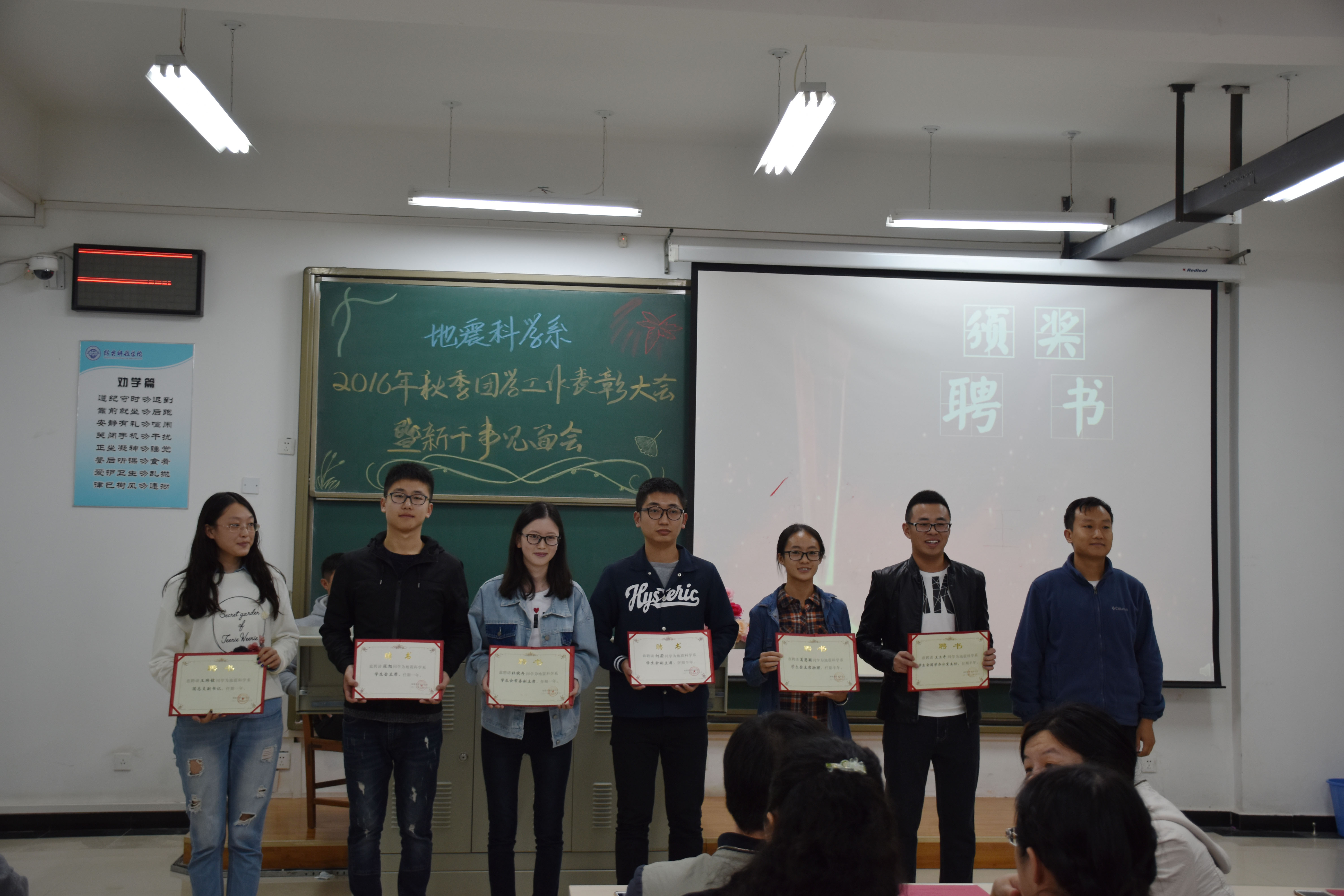 表彰大会上,王鹤、张玉琛、秦海啸、牛永君老师先后为获得团总支员工会2015-2016学年第二学期“优秀干事”、“优秀干部”、“团学工作贡献奖”和“团学工作特殊贡献奖”的同学颁发证书,牛晓龙老师代表系团总支为上届员工干部颁发“聘书”。上届员工会主席张旭、新一届团总支副书记陈建航、新任部长代表张艺潇、新干事代表吴佳怡先后上台发言。各部门新干事在部长的带领下依次上台与大家见面,口号响亮、风格各异,展现了2016级新干事们的朝气蓬勃、团结自信的精神风貌。最后地震科学系团总支书记唐圣华老师总结讲话,他对上学期的主要工作成绩进行了回顾,对本学期的工作进行了布置,他希望同学们要不忘初心,不断前行,保持积极的工作热情,团结协作,共同努力,把地震科学系的团学工作做得更好,再创佳绩。
