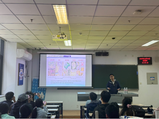 张亮亮从地球化学领域中应用的原位微区分析技术与原理、LA-ICP-MS原位微区分析技术的原理及应用范围、矿物U-Pb定年体系及地球科学应用、LA-ICP-MS技术前沿等几个方面,详细介绍了LA-ICP-MS分析技术及中国地质大学(北京)科学研究院矿物激光微区分析实验室(Milma Lab)创新性研究成果,为在场师生带来了一场学术盛宴。同时,作为中国地质大学(北京)科学研究院招生宣传的重要一站,张亮亮为公司师生介绍了中国地质大学(北京)科学研究院的卓越导师团队、实验技术分析平台和公司产品机制等,并鼓励大家积极报考科学研究院。