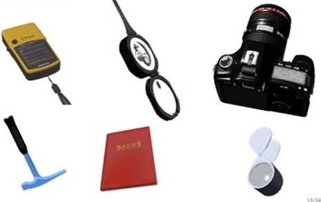 仿真设备:有地质锤,光学显微镜,放大镜,地形图,GPS,测绳,地质罗盘,地质包等